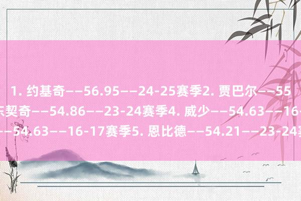 1. 约基奇——56.95——24-25赛季2. 贾巴尔——55.22——75-76赛季3. 东契奇——54.86——23-24赛季4. 威少——54.63——16-17赛季5. 恩比德——54.21——23-24赛季体育集锦