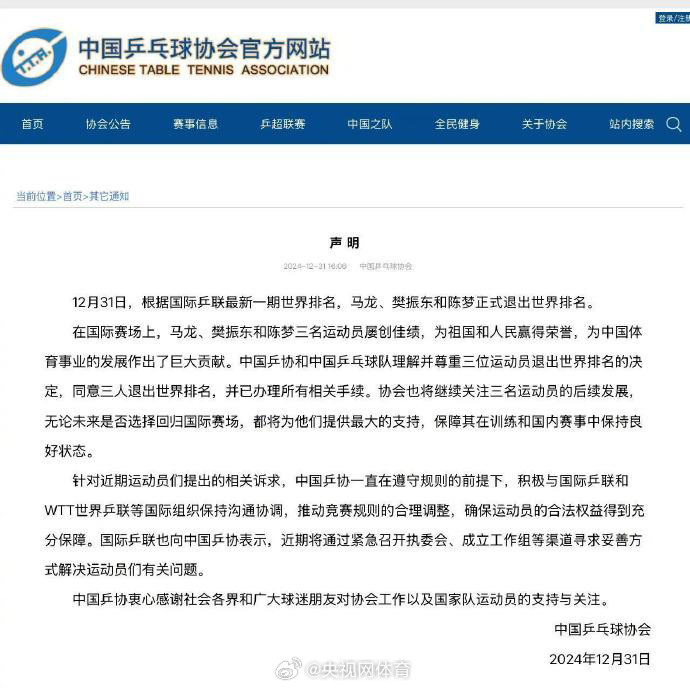 中国乒协诚意感谢社会各界和精深球迷一又友对协会责任以及国度队分解员的守旧与怜惜体育集锦。